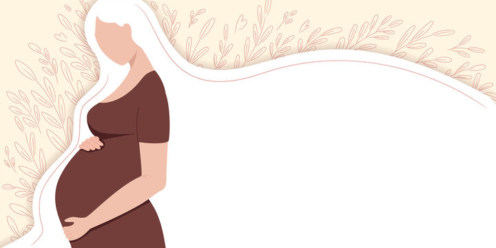 Banner template with beautiful pregnant woman and hand drawn elegant leaves background. Young beautiful pregnant woman, side view silhouette. Pregnancy flat character with long hair