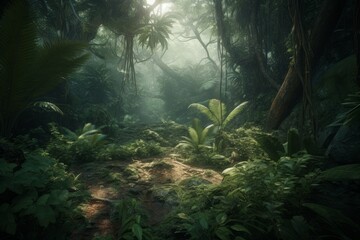 serene prehistoric forest landscape with towering ancient trees and vibrant fern undergrowth showcasing rich biodiversity and lush vegetation of primeval ecosystem era ancient natural ecosystem
