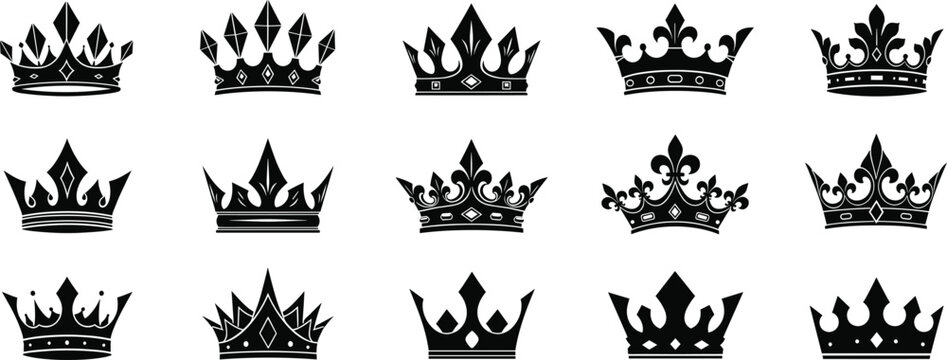 Black crown silhouette vector collection featuring elegant royal designs, luxury tiaras, and classic monarchy symbols for premium branding