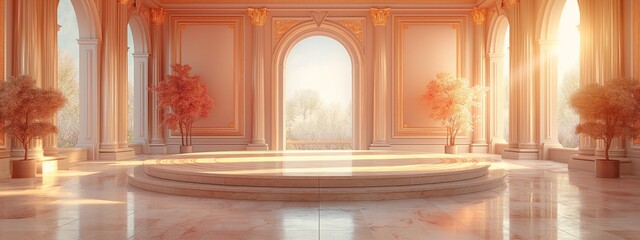 Elegant Podium, front view focus, with a Royal Palace Ballroom Background. Pedestal for presentation premium product.