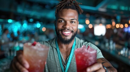 A cheerful man holding two vibrant cocktails at a trendy bar, showcasing the excitement of nightlife and social gatherings in a lively atmosphere with unique drinks.