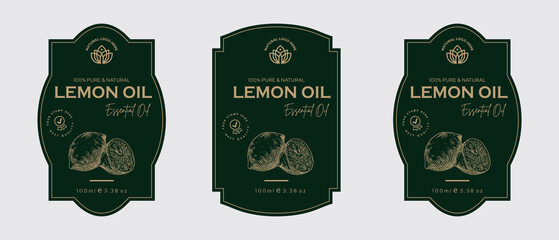 Lemon oil label design cosmetic products for skin care and beauty, herbal ingredients. Labels with sketches, package emblem. Green gold premium vector illustration