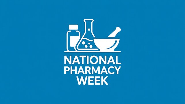 National pharmacy week celebration with iconic symbols of medicinal preparation and healthcare on a vibrant blue background