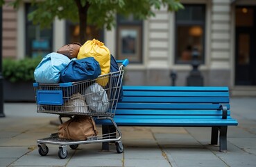 Shopping cart full of bags sits beside empty blue bench on city street. All personal belongings are packed, ready for travel or temporary stay.
