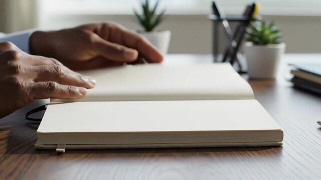 opening a notebook at a desk. A calm preparatory moment showing a notebook being opened and its first page turned.
