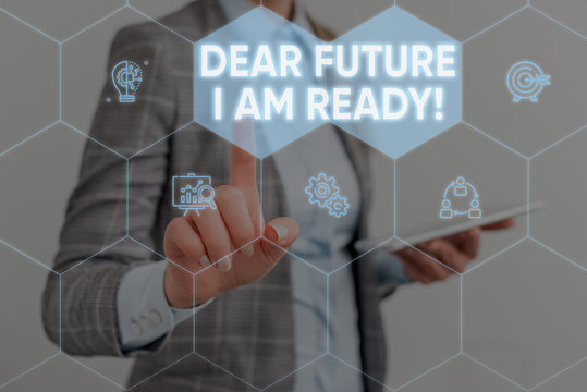 Conceptual hand writing showing Dear Future I Am Ready. Concept meaning suitable state for action or situation being fully prepared Woman wear work suit presenting presentation smart device