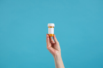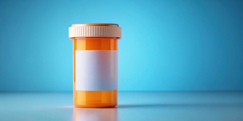 Orange pill bottle with blank label on blue background, pill bottle, medication, pharmacy, healthcare