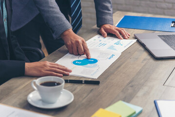 Two businesspeople meeting work at office desk. Teamwork partners team with Business strategy chart graph, infographic data financial report. Team partner planning marketing finance excel stat report