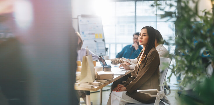 Business asian woman sitting in office meeting presentation ESG and technology innovations recycle material for sustainable product