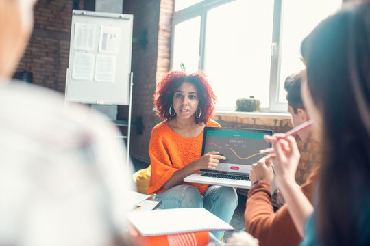 Business manager, ceo or leader holding digital tablet presenting financial data to colleagues in meeting. Brainstorming and planning ideas with market research in a finance startup company office