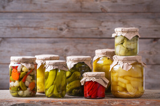 Homemade preserved and fermented food, pickled and marinated vegetables