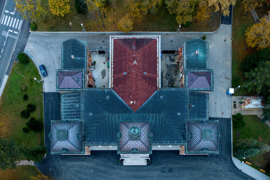 Aerial view of the Presidential Palace's symmetrical architecture, blending rich terracotta roofs with deep blues and greens, stands majestically amidst the surrounding parkland, Zagreb, Croatia.