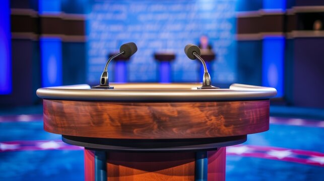 Presidential debate on the eve of the US presidential election. A stylized microphone inside a star. 2024.