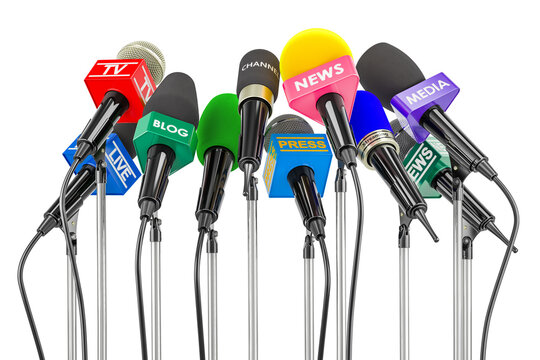 Microphones of different mass media. Press conference or interview concept. 3D rendering isolated on transparent background