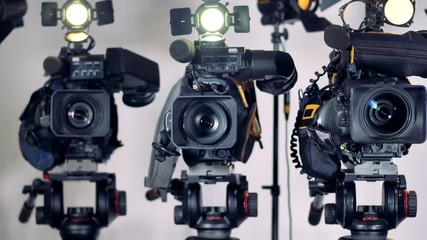 A zooming in on three professional video cameras.