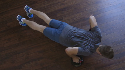 Focused man doing kettlebell push-ups in gym