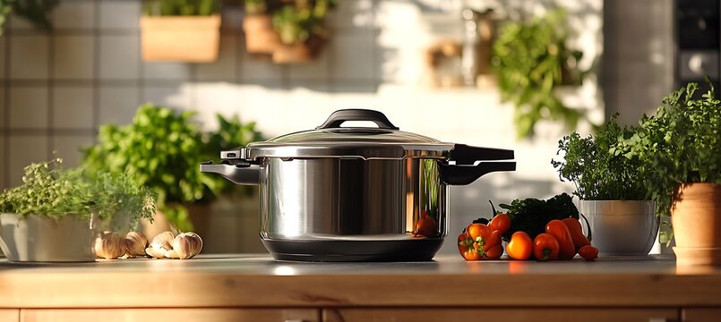 Sleek stainless steel pressure cooker on stovetop surrounded by fresh vegetables in modern kitchen