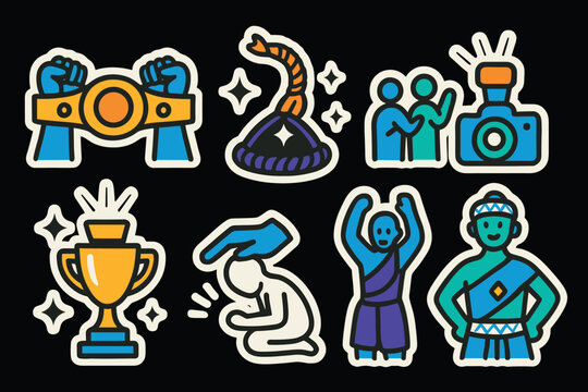 Awards and achievements flat icon set. Medals, stars, trophies, and badges collection