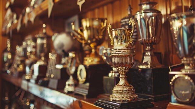 Variety of trophies displayed on wooden shelf, signifying awards and achievements