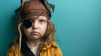 Child pretending to be a pirate, eye patch and hook, deep sea blue background.