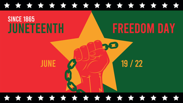Large hand holding a raised chain against a Juneteenth themed background. Symbol of freedom and justice. Copy space included for a title, message or branding.