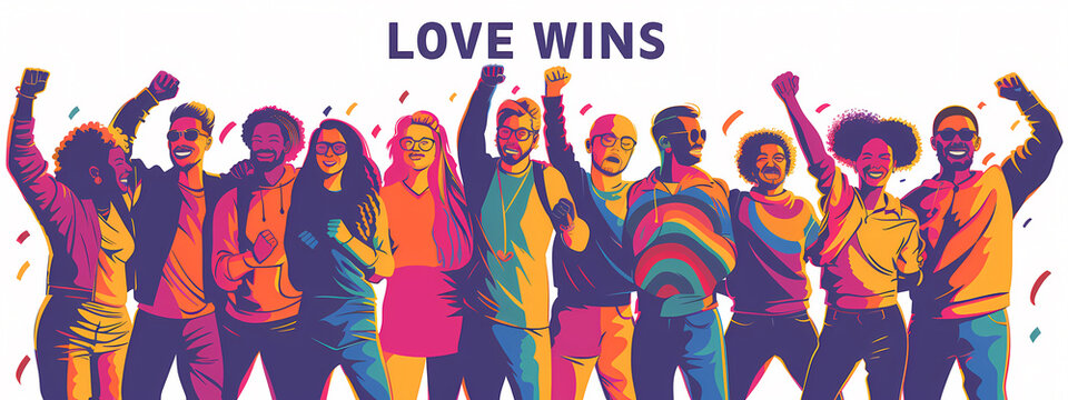 A vibrant group of diverse individuals celebrating with joy and unity, embodying the message 'Love Wins'. Bright colors and festive mood shine through.
