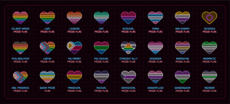 Pride flags complete set, coloful neon heart shapes. Queer pride month flags, original flags, sexual orientation, gender expression and identity complete collection.