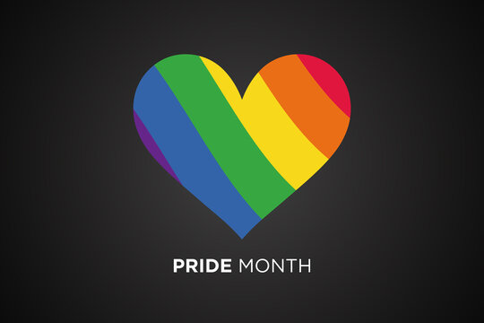 Pride Month or Love Month in June. LGBTQ multicolored rainbow flag hearth shape on black background