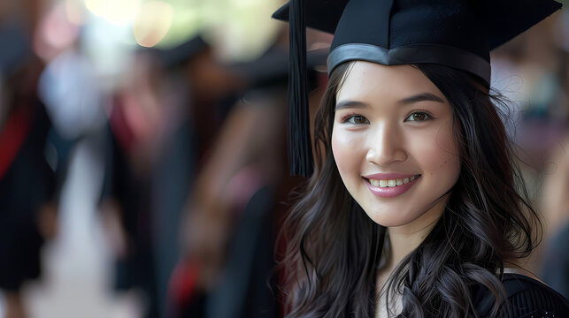 Graduation Day Joy: A young woman with long dark hair radiates with pride and joy as she poses in her graduation cap and gown, a symbol of her academic achievement and a bright future ahead.