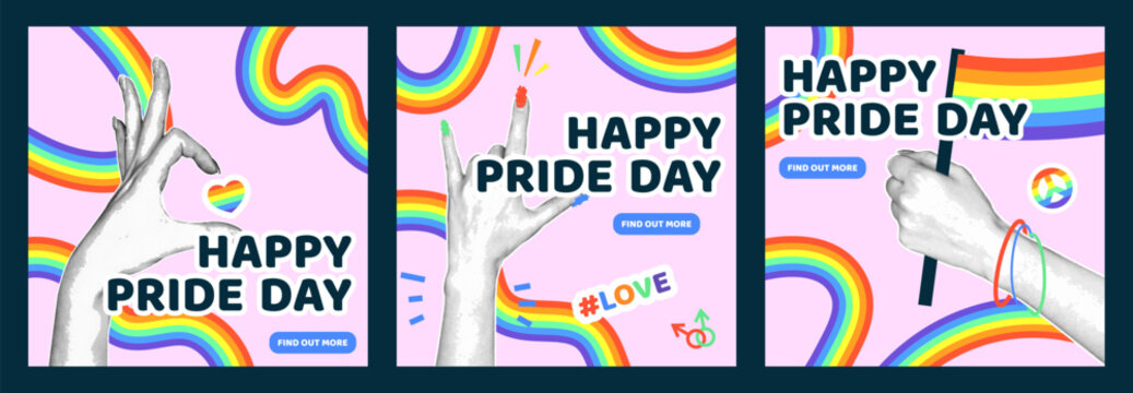 Set of square flyers on the theme of pride month in retro collage style. Vector illustration of female hands with halftone effect, wavy rainbows drawn by hand.