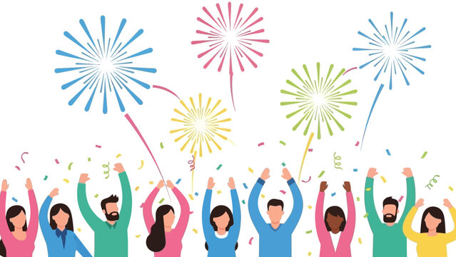 Diverse team rejoicing with fireworks and confetti for successful product launch or celebrating company milestones with vibrant energy and shared joy
