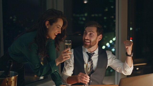 This vibrant office scene captures professionals celebrating a significant achievement, with confetti in the air and jubilant gestures indicating success and camaraderie.