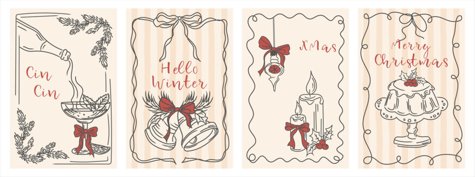 A collection of hand-drawn vintage Christmas and winter greeting cards. Minimalistic retro designs featuring candles, cake, bells, and champagne.