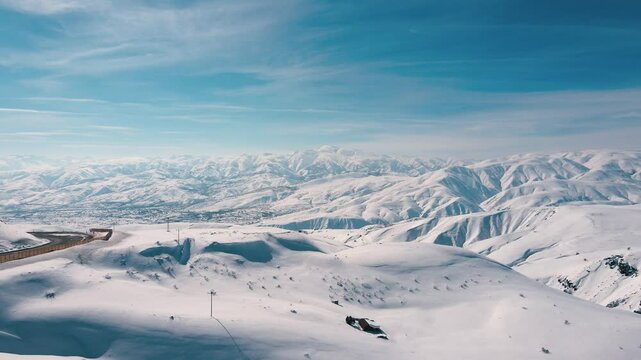 Drone flying above snowy pine forest revealing breathtaking view of winter mountain landscape with snow covered slopes and low clouds covering valley on sunny day. Winter wild nature travel background