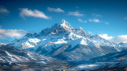 Snow-Capped Mountains Under Blue Skies: Highlight the pristine beauty of snow-capped mountain peaks set against the deep, clear blue skies of winter, emphasizing a striking natural color contrast.