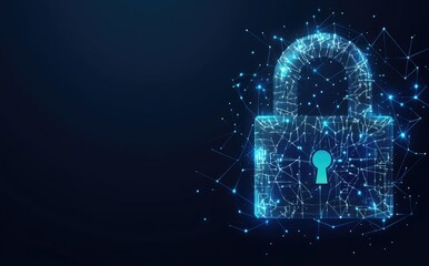 A digital illustration of an open padlock glowing with blue light on a dark background, interconnected lines and dots, ideal for cybersecurity campaigns