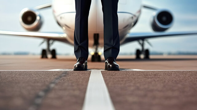 handsome businessman in formal suit and tie standing near private jet. Generative AI