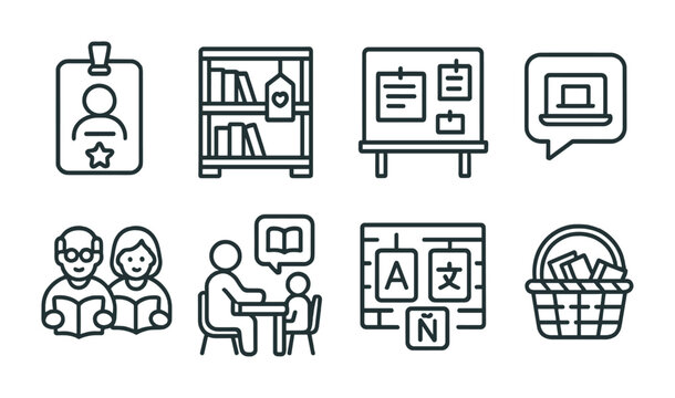 Line style icons of community library services: volunteer badge icon, donation shelf tag, community events board, help with tech bubble, seniors book club, reading tutor desk, language learning wall,