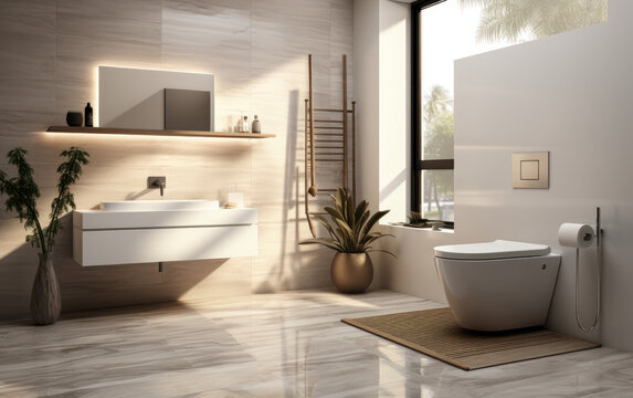 Minimalist bathroom interior. White toilet bowl on marble tiled wall. Modern wc design. Daylight illuminates washroom with green plant. Luxury apartment restroom. Home concept.