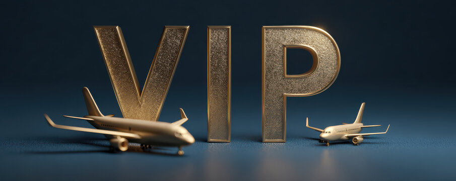 Golden VIP letters flanking airplane models symbolize exclusive travel experiences or aviation privilege