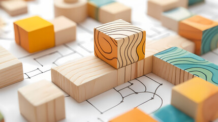 Creative problem solving using wooden blocks and diagrams to illustrate pathways in a strategy session. Firebloom. Illustration