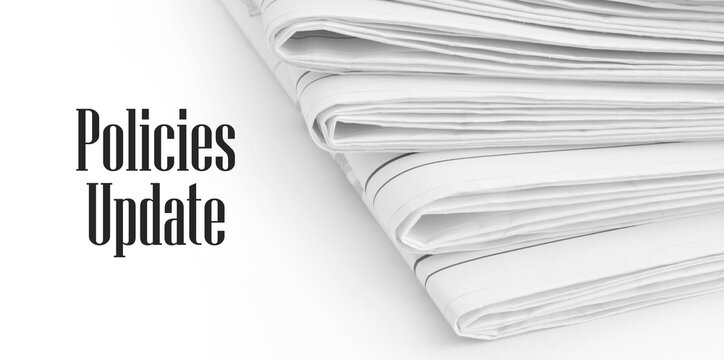 Policies update message written on ripped blue torn paper on black background. Conceptual policies update symbol. Copy space.