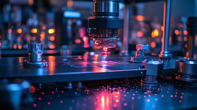 A state-of-the-art cleanroom showcases intricate semiconductor lithography machinery. Soft lighting guides technicians as they operate precision instruments for microfabrication