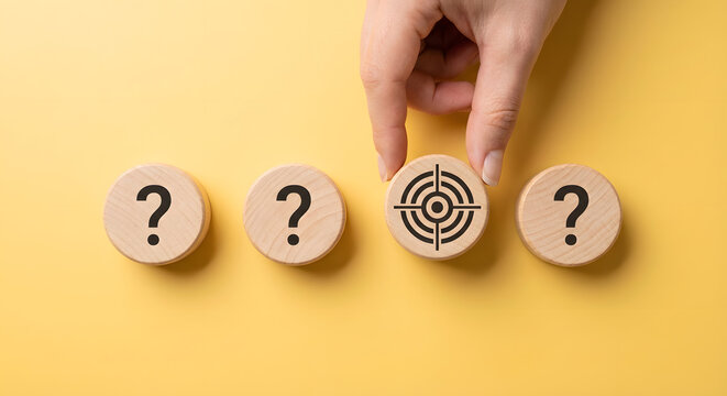 Hand Placing Wooden Token with Target Icon Next to Success Checkmarks on Bright Yellow Background
