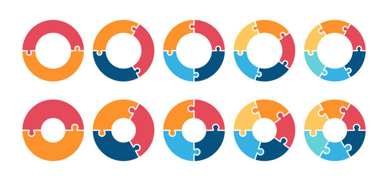 Colorful puzzle circle chart stages. Diagram infographic set. Circle vector 2, 3, 4, 5, 6, parts. Process and segmented concept