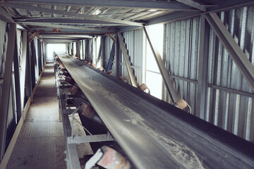 Potatoes being washed on conveyor belt in food processing plant. Concept of food production, agriculture, industry, and manufacturing