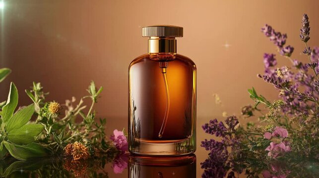 Golden brown perfume bottle with flowers around, product advertisement in natural concept.