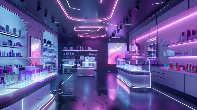 background for a skincare showroom in a cyberpunk world, with sleek displays, neon accents, and high-tech product demonstrations