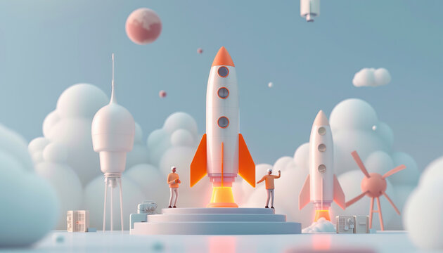 Launching new product or service. technology development process. space rocket launch. 3d render. 3D Render. Illustration
