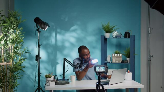 Man showing product on camera and filming vlog for social media. Vlogger doing review of light with mutlpile colors in studio, using equipment for video. Blogger reviewing colorful lights